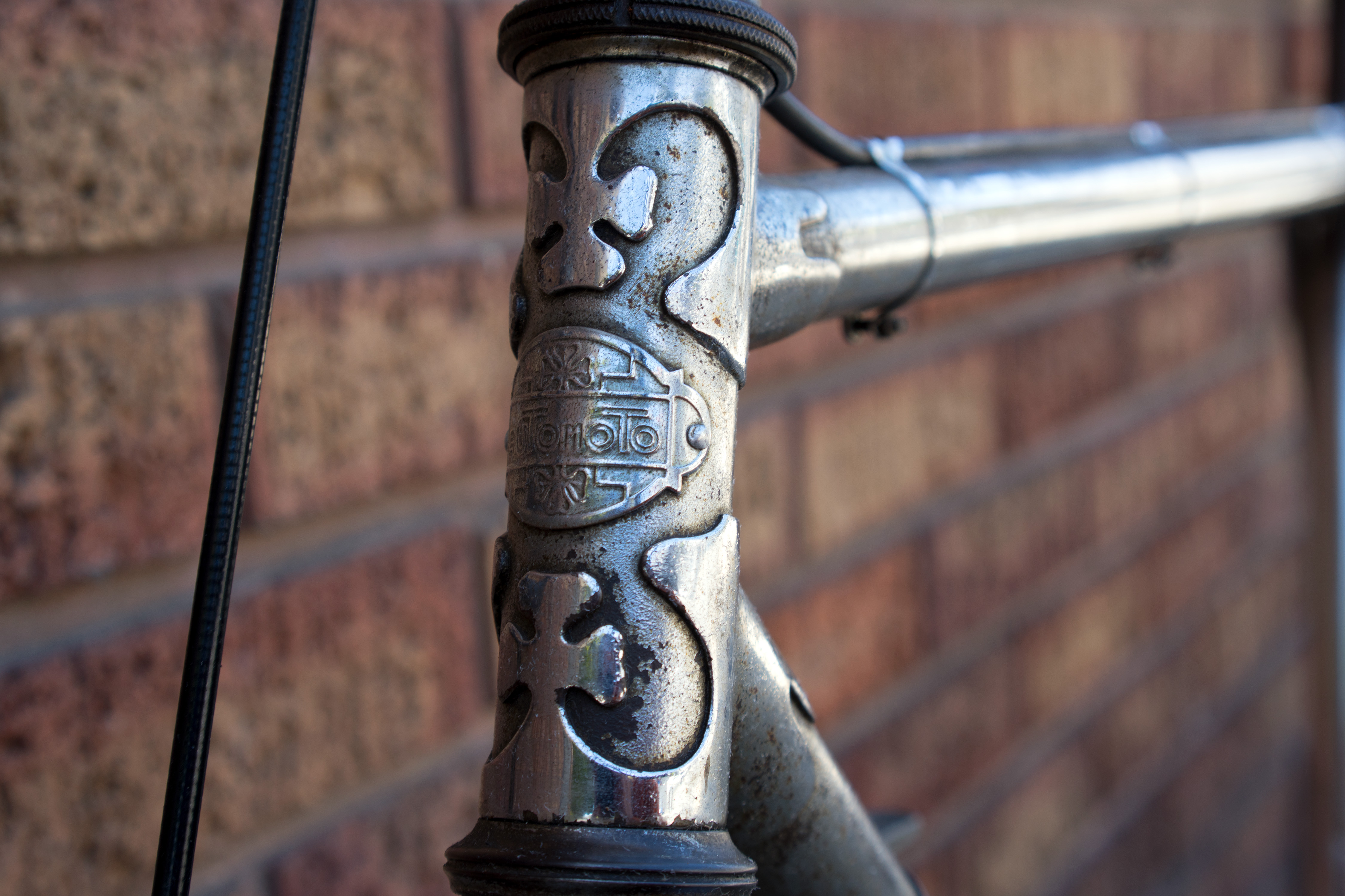 Lucky collectors of Automoto bicycles especially appreciate the sculpted clover lugwork found on fancier frames and trademark fork crowns. Mated to long rake fork blades, the stylized square crown with clover coin inserts was “purposely designed so as to withstand the most violent efforts, especially braking strain, and suppress all vibrations,” according to 1957 company literature, and it achieves these objectives remarkably well in a passive suspension package.